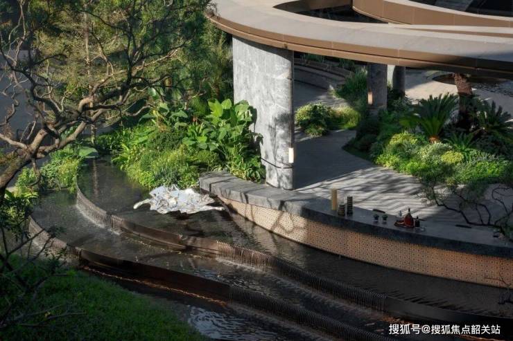 项目打造定制化五重归家动线体系,以高端石材与珍稀物料奠定归家尊贵仪式感。归家入口采用马达加斯加进口翡翠蓝奢石打造对景景墙,单幅奢石造价超百万元,石材天然纹理自带星河流光质感,昼夜光影变化下呈现不同视觉效果,构筑高端隐秘的入户仪式基底。社区园林融合岭南传统造园意境与星级度假酒店造景理念,以传统园林亭台楼阁、曲径通幽的空间逻辑为基底,打造悠长蜿蜒的景观廊架,实现一步一景的游园体验。同时独创三重伴水归家系统,引水入园贯穿整体归家动线,结合水景、绿植、景观小品形成层次丰富的园林体系,园林实景全部完工呈现,兑现力贯穿项目开发全程。
