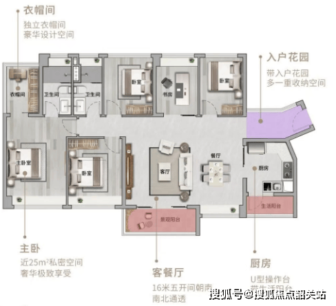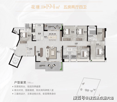194㎡五房两厅四卫(三套房):双景观阳台设计,观景生活两不误,奢华主套配衣帽间。