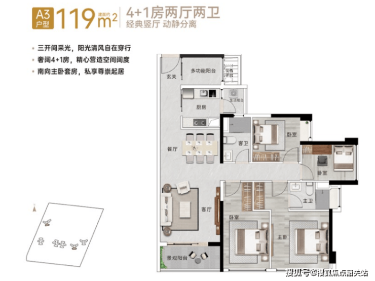 119㎡四房+1空间:单边位布局,南北通透,主卧配有独立衣帽间,适合改善型购房者。