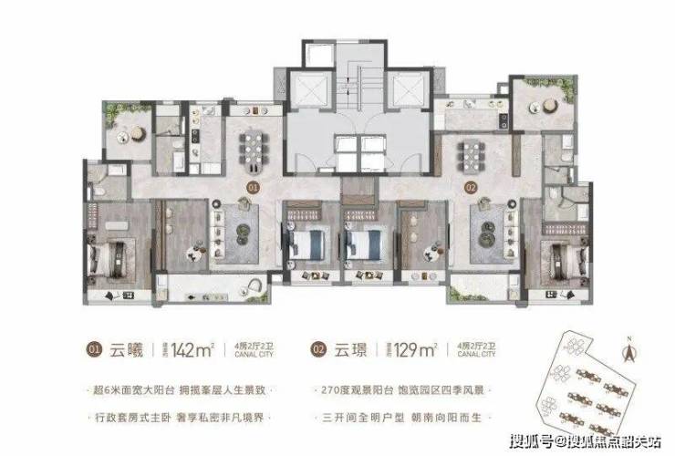 142㎡楼尊户型:创新性植入6米挑空露台,打造出“第三会客厅”概念。