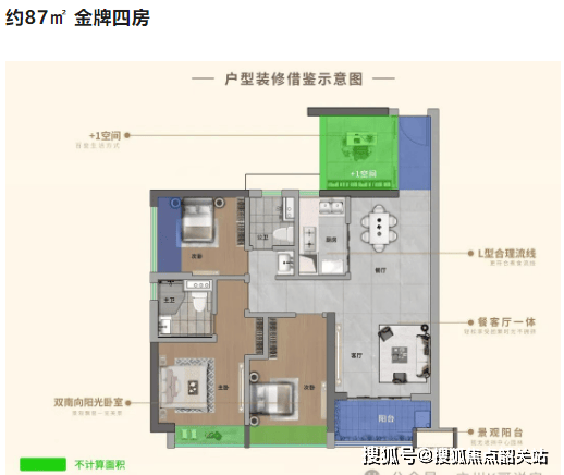 约87㎡金牌四房:南北通透,通风采光俱佳。