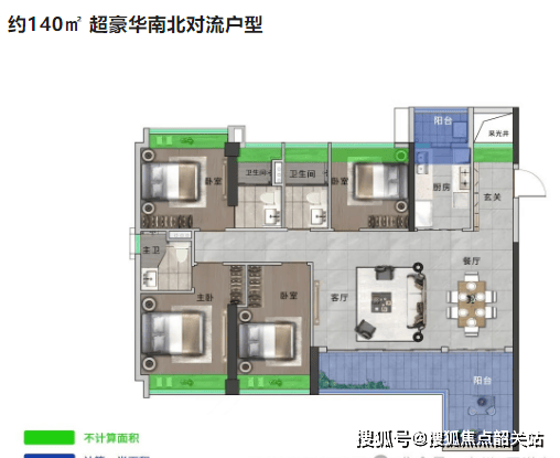 约140㎡超豪华南北对流户型:宽敞舒适,适合大家庭居住。
