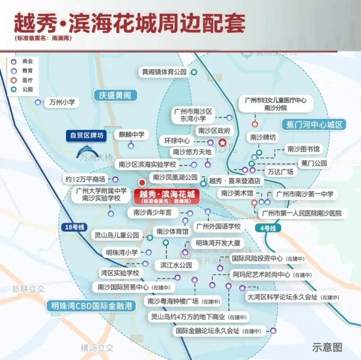 项目地处南沙明珠湾起步区与庆盛科创走廊的交汇点,直线距离广外附学校300米、地铁15号线(规划)500米、万达广场1.5公里,形成“10分钟生活圈”。周边3公里内聚集香港科技大学(广州)、南沙科学城、国际金融岛等高能级配套,未来5年将导入20万高净值人群,住房需求激增。