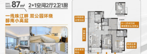 87㎡三房:三开间朝南,赠送面积达7.56㎡,实际得房率约92%,配备3.4米观景阳台,主卧达14㎡;
