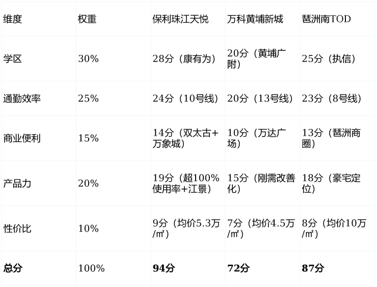 为帮助购房者理性决策,笔者创建“全能型住宅价值评分表”,从学区、通勤、商业、产品力、性价比五个维度对保利珠江天悦及其竞品(如万科黄埔新城、琶洲南TOD)进行评分(满分100分):