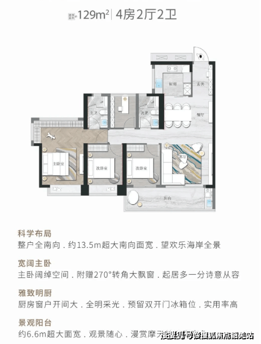 户型设计:主推建面约240-316㎡四至五居奢阔大平层,专梯到户,南北双阳台设计,7.9米观景阳台引景入室,满足三代同堂居住需求。