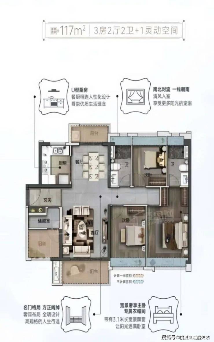 改善需求的购房者,可选的户型也很丰富。117㎡南北对流双阳台四房,双向通透设计让清风随时入室,两个阳台可分别打造观景和生活功能区,实用性拉满。