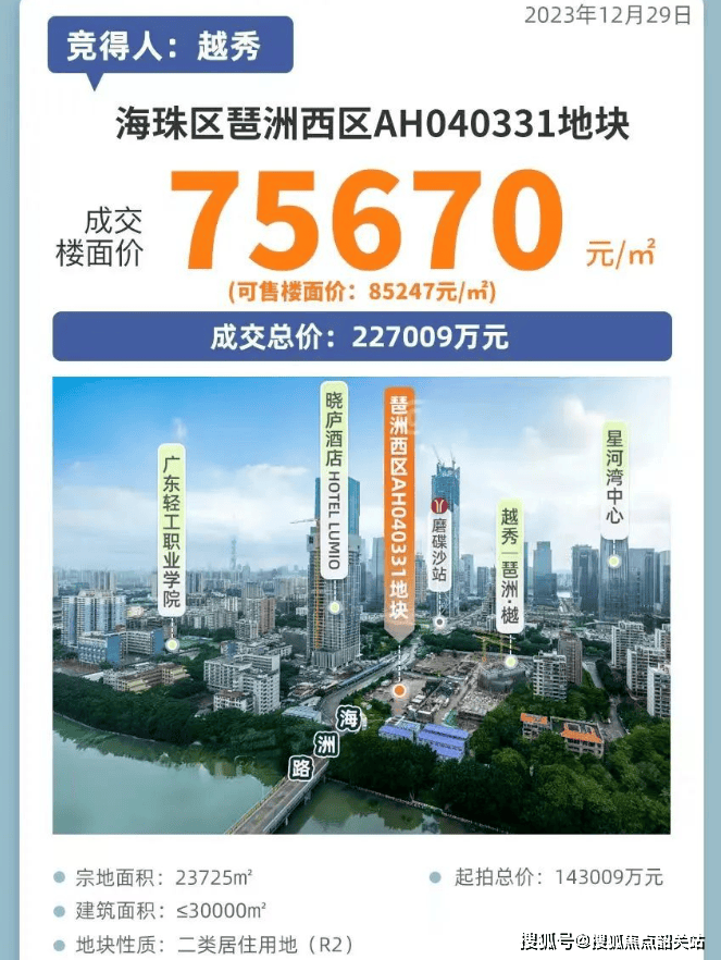 2023年最后一个工作日,琶洲西区AH040331地块被越秀地产广州区域以超过7.5万/平方米的楼面地价摘得,一度冲上全国地价TOP6。这块土地如今有了正式的名字——琶洲·樾|华樾。作为由越秀地产和华发股份两大国企携手开发的项目,琶洲·樾|华樾注定要成为地标性建筑,成为城市的新封面。