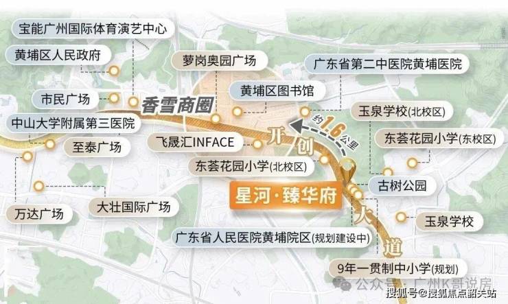 星河臻华府落位广州市黄埔区科学城香雪成熟片区,地处开创大道与开源大道两大城市主干道交汇处,是科学城与云埔片区城市界面的核心衔接节点。