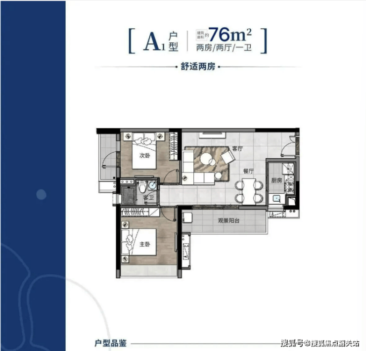 76㎡两房两厅一卫:南向全明,一体化客餐厅 + 大飘窗(不计面积),实用率约 80%,总价 125-140 万,刚需首选