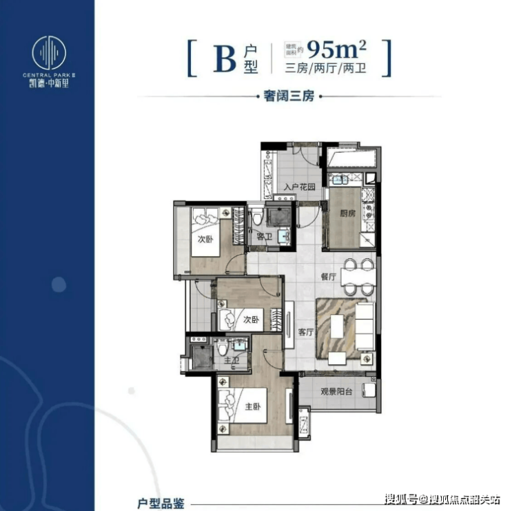 95㎡三房两厅两卫:南北通透、双阳台,主卧套间,实用率约 80.5%,总价 170-190 万,三口之家优选
