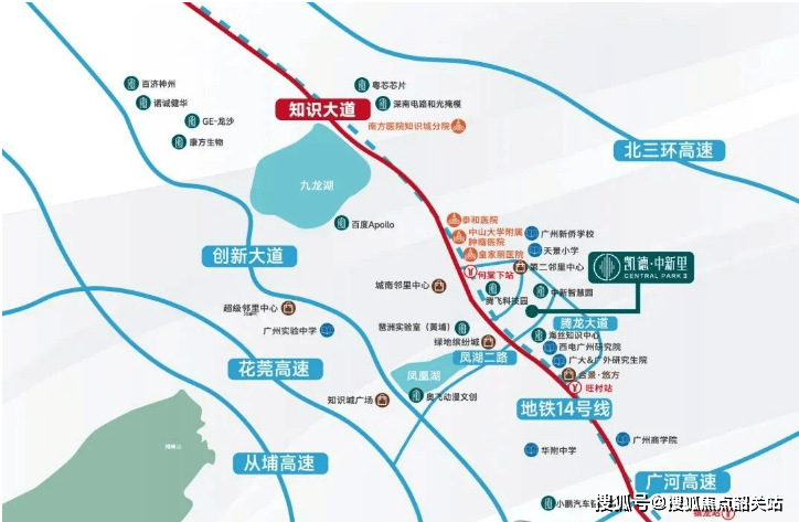 主干道:紧靠知识大道(知识城南北主干道),无缝连接九龙大道、广河高速、花莞高速,自驾 30 分钟到科学城、40 分钟到天河、50 分钟到白云机场。