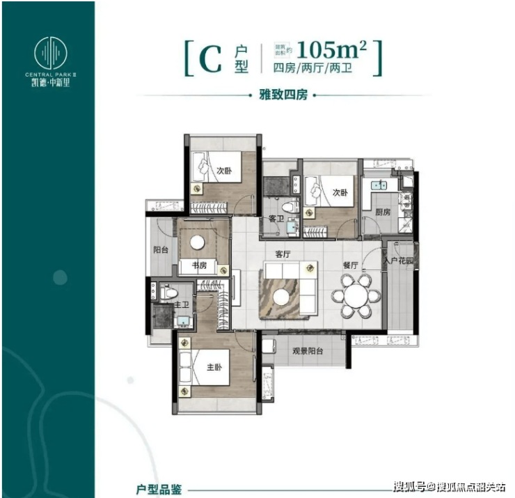 120㎡四房两厅两卫:阔绰四房、南北对流,主卧独立衣帽间,实用率约 81%,总价 220-250 万,多代同堂首选