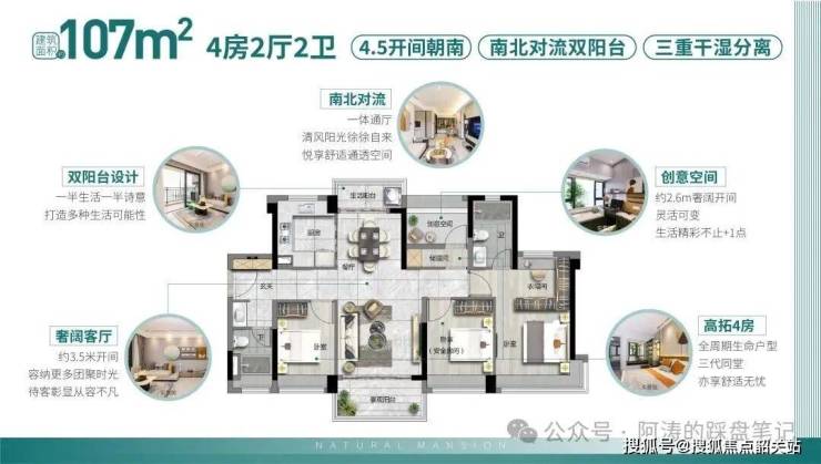 超大空间:建筑面积约107㎡,南北对流双阳台四房设计,空间阔绰,功能分区明确。