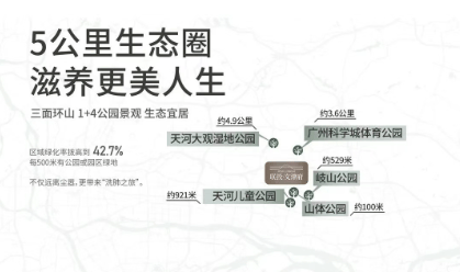 项目内拥 “三面环山”,大灵山、长岗山、横山、简山环绕,人均公共绿地面积达 13.4 平方米。外揽 “1 + 4 公园”,包括山体公园、天河区儿童公园、岐山公园、天河大观湿地公园、广州科学城体育公园。内部规划 “一轴两心三节点六境园韵” 的低密奢境,以景观主轴、两大中心花园、三大榕树林下空间,营造自然生长的家园。