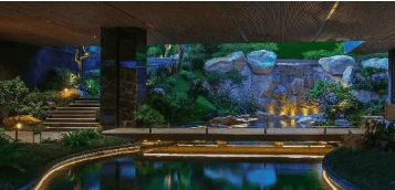 小区中心位置的山水会客厅,参照赖特流水别墅,结合园林高差打造建面约 1300㎡榕樾山水会客厅,兼具实用性与高级感。分上下两层设计,上层有无边界成人 / 儿童双泳池,下层 AI 智慧自习室与火石健身空间动静相宜。30 余种珍稀植物打造林下空间,让建筑与溪瀑、叠石共生共长,集健身房、瑜伽室以及儿童悦美学堂于一体,目前运动空间已引进著名火石健身开展运营,为业主提供高品质休闲健身与学习交流场所。