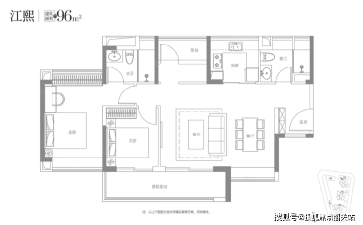建面约96㎡的2+1房:包含竖厅设计和横厅设计两种户型,采用主人房与次卧分开的设计理念。