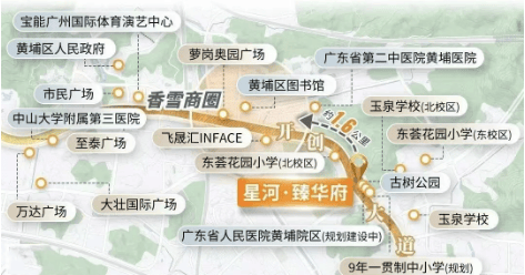 项目虽然距离最近的地铁站(香雪站)约2.1公里,但周边有发达的主干道如开创大道和开放大道,通过这些道路可以快速连接广园快速、京港澳高速等主要交通线路,实现半小时左右到达天河中心区域的目标。
