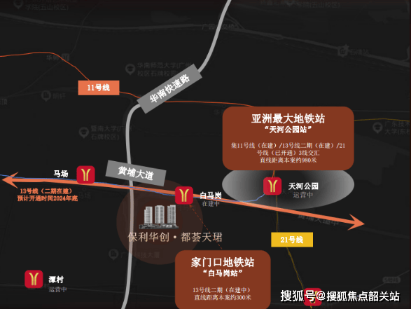 项目交通便捷,毗邻黄埔大道、中山大道及广园快速路等三横三纵主干道,快速衔接珠江新城及金融城核心区域。社区门口规划地铁站,天河公园站三线交汇(11号线、13号线二期在建,预计2024年底开通)和白马岗站13号线二期,出行选择多样。便捷的交通网络不仅支持日常通勤,也满足家庭出行、商业往来及休闲娱乐需求,提高居住便捷性和区域吸引力,为业主提供无缝城市生活体验。