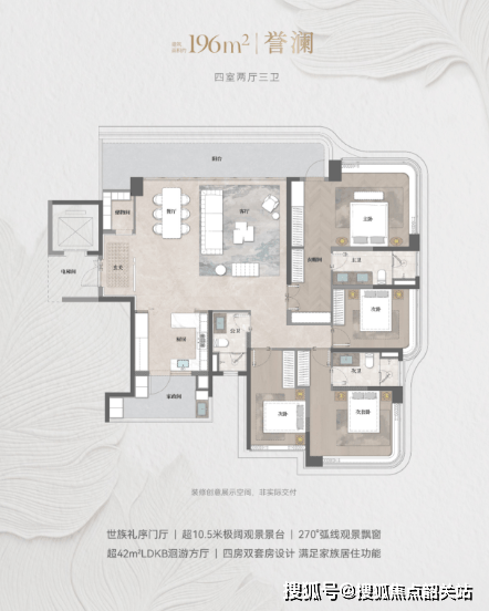 【誉澜】建面约196㎡四室两厅三卫:宽敞舒适,功能分区合理,适合多代同堂的家庭。