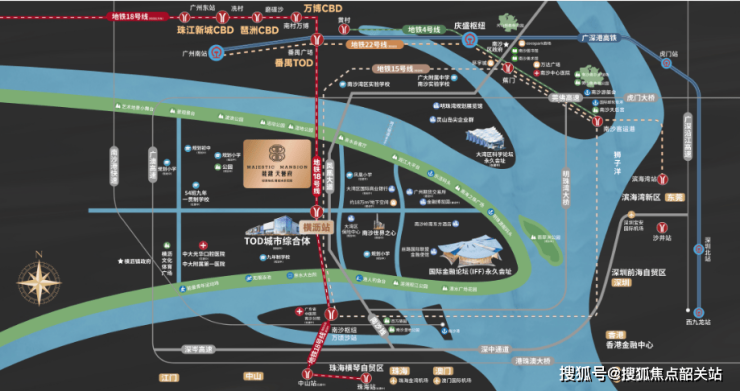 能建·天誉府位于广州南沙区明珠湾横沥岛,紧邻18号线横沥站D出口,直线距离仅约80米。通过地铁18号线(快线),可实现:
