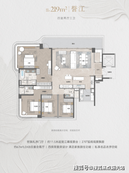 【誉江】建面约219㎡四室两厅三卫:超大面积,适合大家庭或追求奢华生活的家庭。