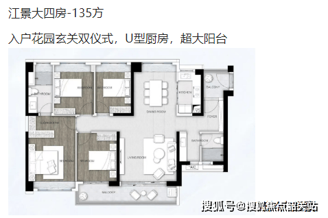 135㎡江景四房:入户花园与玄关双仪式设计,U 型厨房操作台面长 3.6 米,南向阳台长度 7.5 米,实测江景视野角度达 100%,主卧 270° 飘窗可俯瞰砺江湾。