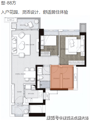 88㎡三房:入户花园实测面积约 4.2㎡,可改造为储藏间或书房,客厅开间 3.8 米,主卧赠送飘窗(进深 0.6 米),实测使用率达 92%,满足年轻刚需家庭基本需求;