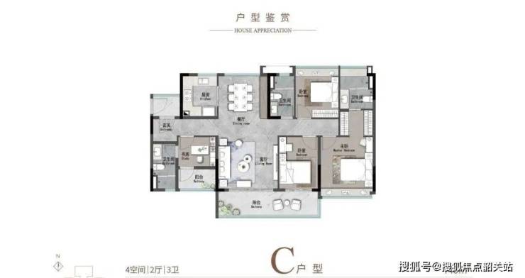 建面140平四房:南北通透,5开间朝南,除客厅和次卧联通阳台外,书房还配有独立阳台。