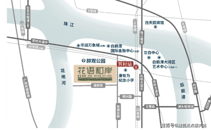 4. 保利花语和岸周边地铁线路形成密集网络,轻松穿梭湾区各处。项目步行约800米可达1号线芳村站,1号线可便捷链接主城区,未来还将接入11号线、22号线(建设中)、28号线(规划中),实现四线合一,0换乘直达广州站、广州南站、白云机场等重要枢纽。同时,花地大道、芳村大道等主干道,珠江隧道等4隧道,以及芳村码头的水上巴士,共同构成了立体交通网络,无论是前往广州各核心区,还是穿梭于湾区其他城市,都能轻松实现高效出行。