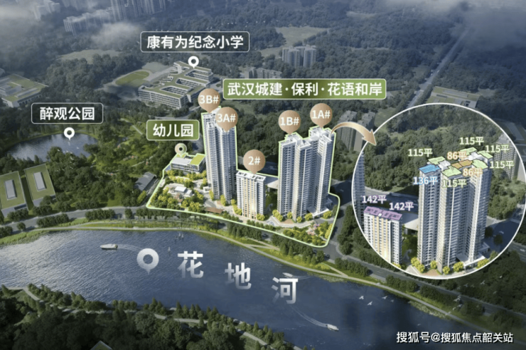 1. 保利花语和岸真正实现了临江而居的惬意,巨幅江景推门即见,园林景致抬眼可赏。项目北侧紧邻花地河,直线距离仅约50米,部分户型如142方北阳台可直面花地河水景,136方单边户能无遮挡俯瞰河景与周边风光,推开门便能感受河水潺潺的灵动。东侧紧邻3.6万㎡醉观公园,面积开阔,是日常休闲漫步的好去处。社区内部绿化率达35%,半包围梯形式排布让多数楼栋能享受园林景观,270°全景阳台、L型飘窗等设计让居住者抬眼可见河景、公园绿意与社区园林的融合景致,自然与生活的距离被无限拉近。