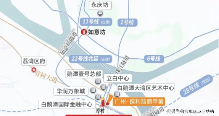 项目临近地铁1号线和11号线芳村站,未来规划中还有22号线、28号线交汇,形成四线交通网络,实现全城CBD快速直达。周边城市主干道及滨江放射线完善,高速与快速路连接便利,通勤效率高。项目与白鹅潭、老西关及越秀中心区的交通距离大幅缩短,原本15-30分钟的车程可缩减至约4分钟,极大提升日常出行效率。未来地铁及交通枢纽规划持续推进,将进一步增强区域通达性,满足居住、商务及休闲出行的多样化需求,同时为江景高端住宅的投资价值提供长期保障。