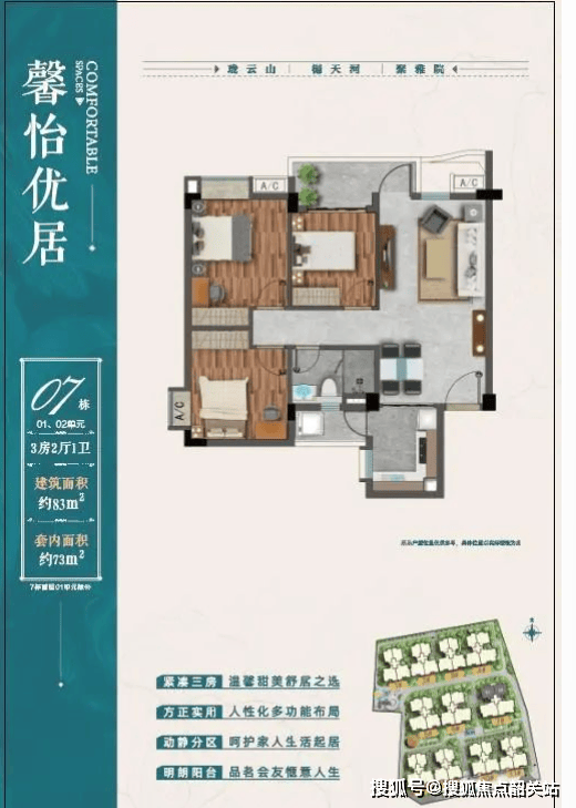 85㎡三房两厅一卫:南北通透,户型方正,空间利用高效。