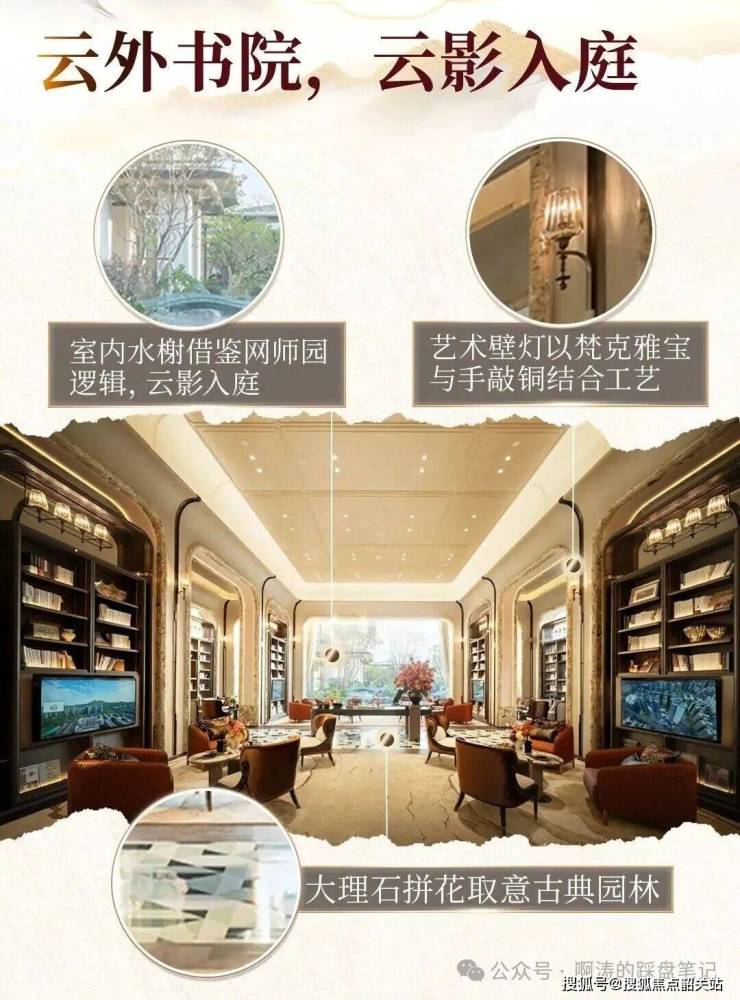 国贸・绿城 | 云樾和鸣打造了全维度的高端公区配套,以五进归家礼序构建了全场景的仪式感归家体系。项目打造了约 9 米高的双层社区归家门庭,搭配社区全覆盖的无风雨归家连廊,实现了从社区入口到楼栋入户的全程无风雨归家。项目采用双大堂设计,负一楼地下车马厅与一楼入户大堂均已实景呈现,每一栋楼栋均配置了约 6.3 米挑高的精装入户大堂,将精致的艺术风格与高端用材从地面延伸至地下,无论业主选择何种归家方式,都能享受到满满的仪式感。社区内打造了云外书院,借鉴网师园造园逻辑,打造了云影入庭的景观效果,搭配大理石拼花、手工艺术壁灯等细节设计,为业主提供了静谧的阅读与学习空间,与一路之隔的培英中学形成了浓厚的书香氛围。社区二楼打造了专属功能空间,包含艺术长廊、室内瑜伽室、女王专属空间等多元场景,可全面满足业主的休闲、社交、运动等多元需求。