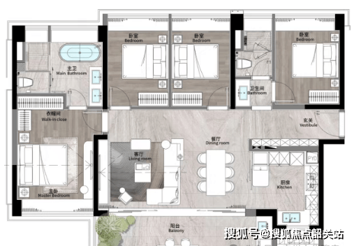 建面约140㎡ 四室两厅两卫(横向):纯正大四房设计,三面采光,光照时间无限延长。约7.7米超长阳台设计,跑道式阳台让生活更加宽敞明亮。