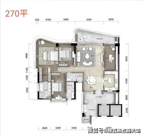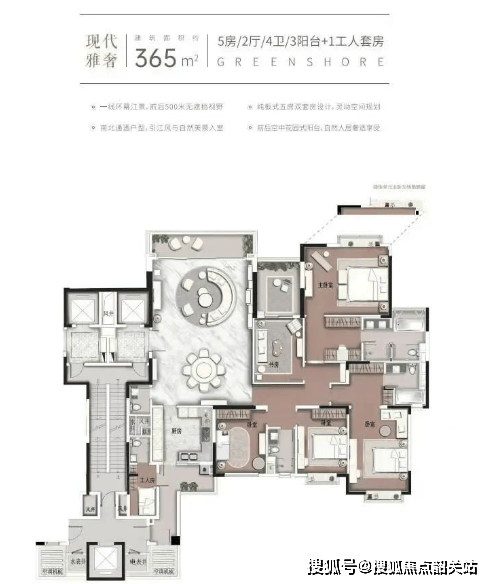 『悦岛』365㎡楼王单位:5房双套房设计,3阳台+工人套房,南北通透格局,主卧面宽达6米,可定制“现代雅奢”或“美学简约”装修风格。