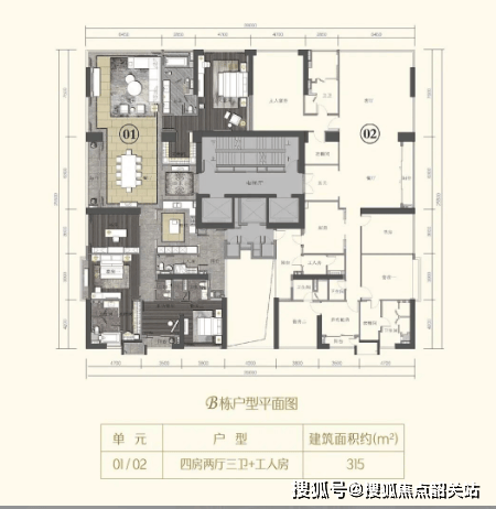 A:使用率高达93%,315㎡户型实得面积接近300㎡,空间利用率极佳。