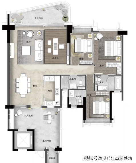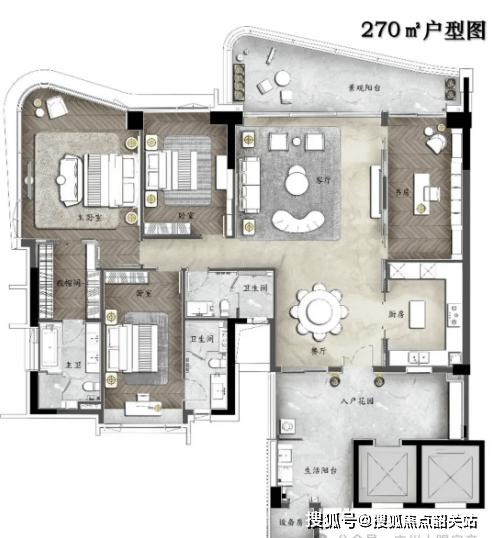A户型:270㎡环幕江景四房,拥有约9米超大阳台,专梯专户设计,配备墅级空中双花园。