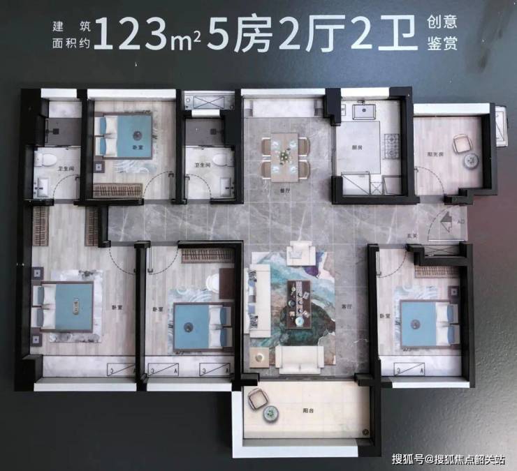 至于123㎡,项目是做到了5个房间,这在市场上还是比较少见的设计,主卧还带一个衣帽间,并且餐厅做了飘窗设计,可以说是非常实用了。