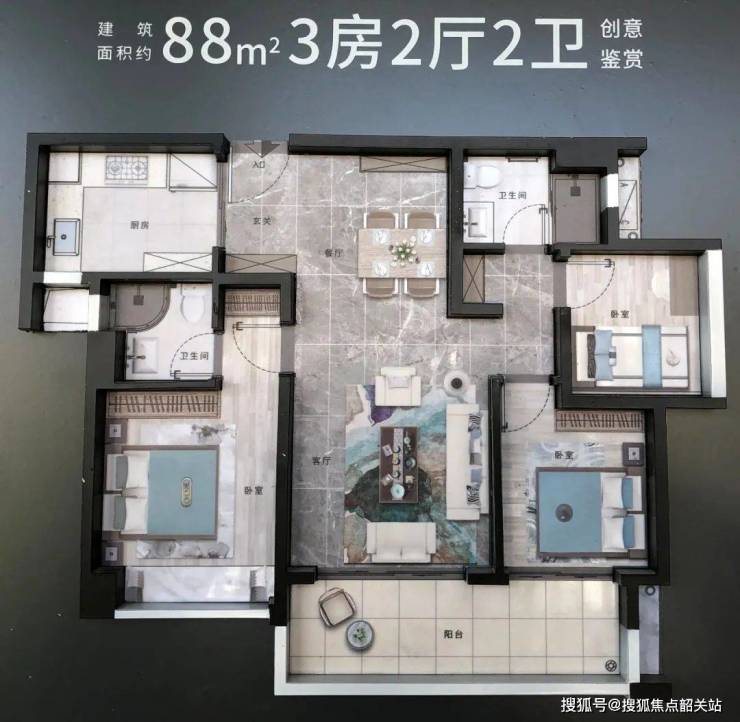 建面约88㎡3房,主卧做了套房设计,景观阳台做得比较宽,从客厅一直延伸到次卧,另外还带一个生活阳台,多一些空间,给生活多几分从容。