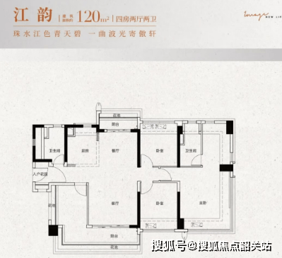 建面约120㎡:四房两厅两卫,四开间朝南+动静分区,南向大阳台与270°飘窗组CP