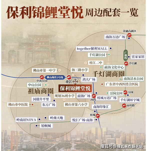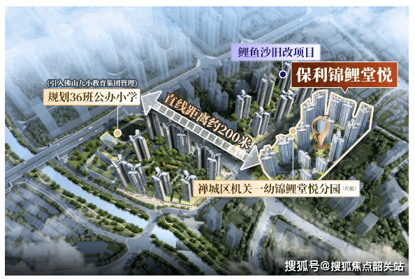 保利锦鲤堂悦由央企保利华南操刀,于2024年底以12.16亿元竞得鲤鱼沙地块,楼面价仅7509元/㎡,成本优势显著。项目总占地约5.2万㎡,建面超22万㎡,规划14栋住宅、1550户,容积率3.1,绿化率达30%,定位为禅桂核心区稀缺的高品质新规住宅。其最大亮点在于地处禅城祖庙与南海桂城交汇处,海三路与文化北路交叉口,一脚踏两区,既能享受祖庙千年文脉底蕴,又能承接千灯湖金融CBD外溢红利。这种“双芯辐射”区位,在佛山极为罕见。尤其对在千灯湖、祖庙、礌岗等片区工作的白领而言,通勤时间普遍控制在15分钟内,生活便利度拉满。更关键的是,该板块近年旧改加速,鲤鱼沙片区整体升级已纳入市级重点工程,未来城市界面将焕然一新。