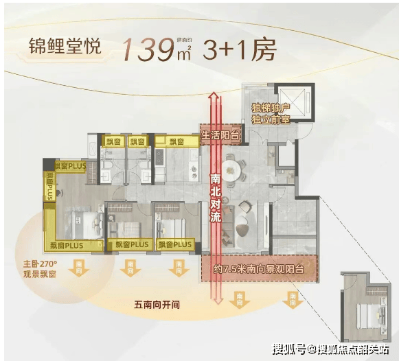 作为佛山首批新规产品,锦鲤堂悦的户型堪称“降维打击”。新规允许阳台计容比例提升至20%,项目借此实现接近100%的使用率,远超旧规产品。主力户型89㎡做到南北对流、三房两卫、6米双面宽阳台、主卧270°转角飘窗,空间感堪比旧规120㎡。108㎡四房实现四开间朝南+南北对流,餐厅开窗引入穿堂风,通风采光极佳。122㎡与139㎡均为专梯专户板楼,其中139㎡更是做到五开间朝南、所有卧室南向带落地飘窗、7.5米景观阳台、独立玄关前室,在佛山市场极为罕见。更巧妙的是,部分户型预留创意空间,可灵活打通为书房或儿童房,满足家庭成长需求。这种“小面积做阔绰、大面积做奢适”的产品策略,精准击中改善客群痛点。