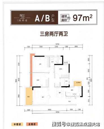 项目主推约 97~123㎡三至四房,均为精装交付,户型设计兼具实用性与舒适度。约 97㎡三房两厅两卫格局方正,双阳台搭配卧室全飘窗,约 9.5 米景观视野开阔,主卧大套间设计实现干湿分离,空间利用率极高。