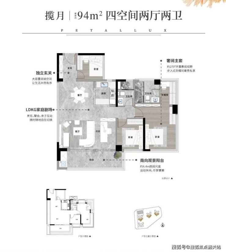 94㎡四房两卫:LDKG一体化设计+6.4米超大阳台,主卧带独立衣帽间