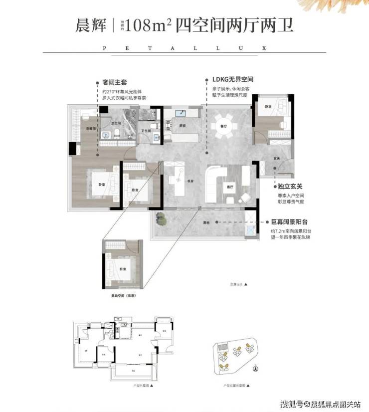 108㎡四房两卫:15米南向面宽+7.2米景观阳台,对标传统145㎡豪宅