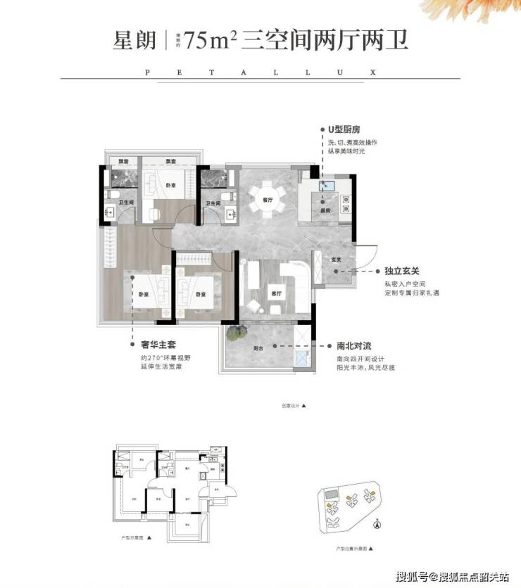 75㎡三房两卫:独立玄关+U型厨房+南北对流,实际使用面积达90㎡