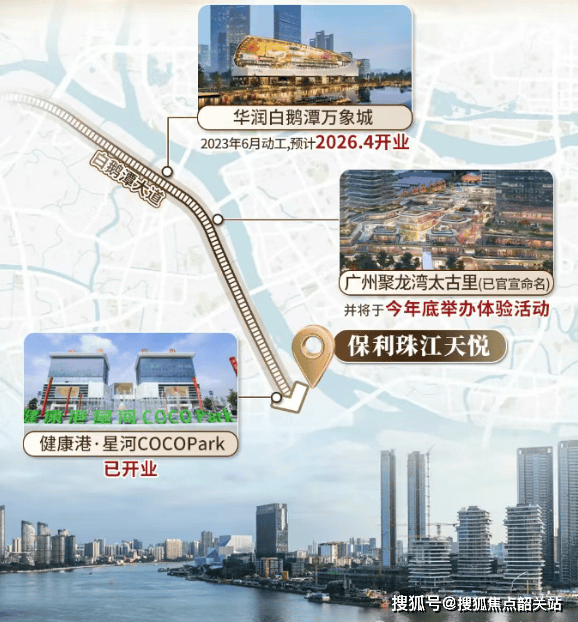 保利珠江天悦位于白鹅潭中心之上,商旅、服务、医疗教育资源顶尖。教育自身配建两所幼儿园与康有为纪念小学(开盘前已确定引进),周边规划 45 班完全中学,教育资源优质。商业荟萃 6 大高能商业,星河 COCOPARK、三馆合一、新黄沙水产市场、双太古、万象城、广船商业综合体总计约 200 万㎡,满足高端消费需求。医疗周边有 1 个医学中心、1 个康复中心与 5 所综合三甲医院,如广州医科大学附属第二医院等,保障健康。社区服务含天悦荟会所,实景呈现园林、车库与入户大堂,居住体验高端。