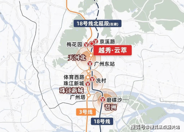 越秀·云萃位于广州市中心区域,距离珠江新城仅5公里。项目周边有两条地铁线路——18号线和3号线,其中18号线京溪路站就在家门口,步行约800-900米即可到达3号线梅花园站。通过这两条地铁线,居民可以轻松直达琶洲、珠江新城、天河北等重要商圈,无需换乘。此外,自驾出行也非常方便,经由广州大道或沙太路可快速到达市中心。