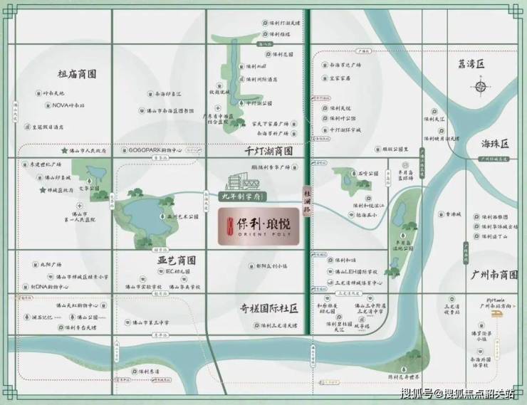 保利·琅悦坐落于桂城轴心,祖庙亚艺湖、千灯湖及奇槎十字中心,占据着第三富人区的核心位置。项目坐拥四横三纵路网,畅达广佛核心区域。其中三纵包括桂澜路、南海大道和佛山一环;四横涵盖魁奇路、季华路、绿景路和海八路。轨道交通方面,项目毗邻6号线(规划中)奇槎站,2号线(已通车)湾华站,2站换乘广佛线,3号线(已通车)亚艺公园站,地铁4号线(建设中)石啃站,实现往西通达佛山西站,往东直达广州南站。